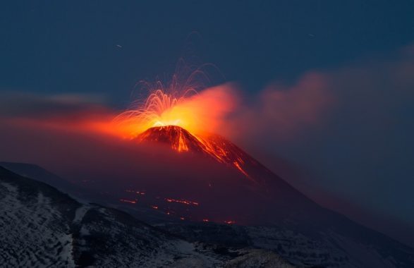 Spettacolare eruzione sull’Etna con una forte fontana di lava, accompagnata da una nube eruttiva, dal cratere di Sud-Est. Uno dei due trabocchi lavici è ben alimentato e il suo fronte ha raggiunto una quota 2.800 metri sul livello del mare, l’altro si propaga in direzione Est e ha raggiunto l’alto orlo occidentale della valle del Bove.