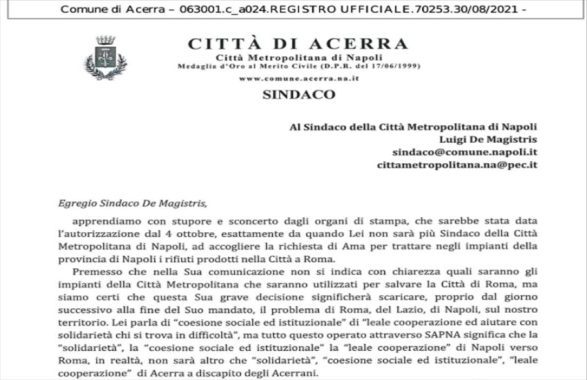 Non permetteremo che la colpa dell’inettitudine di altri ricada sul nostro territorio: non consentiremo che Acerra diventi la discarica delle beghe e delle furbizie di altri e della spazzatura della Capitale. Piuttosto, vorremo suggerire di “copiare” le buone pratiche che la nostra Città e i nostri Cittadini adottano in materia; suggeriamo a Lei, ma anche ai futuri amministratori della Città Metropolitana di Napoli e di Roma, di agire esattamente come fanno quotidianamente i cittadini di Acerra, pratiche necessarie e utili a consentire di gestire dignitosamente il ciclo dei rifiuti urbani nei territori interessati, senza scaricare i problemi su altri luoghi. Queste potrebbero essere, finalmente, decisioni che potranno superare la grave situazione della Città di Roma come di altre città”.