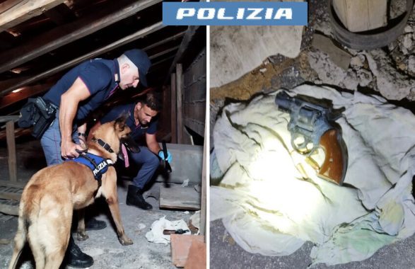 A scovare l’arma è stato il cane poliziotto “Maui”, che con il suo infallibile fiuto ha condotto gli agenti fino al sottotetto dello stabile. Avvolti in un panno, gli agenti hanno recuperato, oltre al revolver, anche il relativo munizionamento e altre cartucce calibro 7.65.