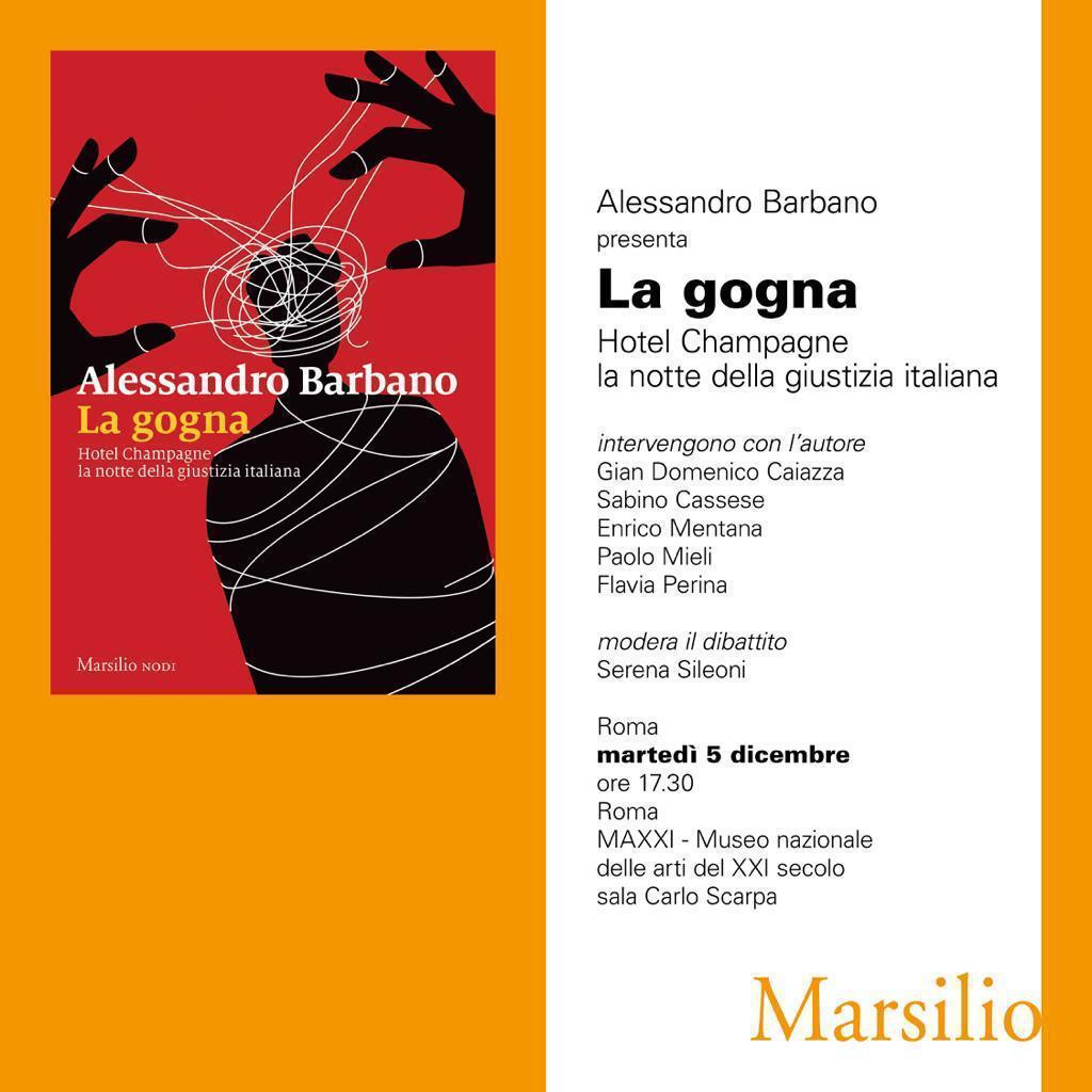 Martedì 5 dicembre alle ore 17:30 al MAXXI in via Guido Reni 4A, a Roma, si terrà la presentazione del libro in uscita con Marsilio “La gogna. Hotel Champagne, la notte più buia della giustizia” a firma del giornalista Alessandro Barbano.
