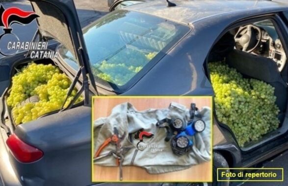 All’interno dell’abitacolo i Carabinieri hanno trovato tronchesi, utilizzate per tagliare reti e recinzioni, forbici da potatura e vari teli tipicamente impiegati per raccogliere e nascondere velocemente l’uva rubata prima di caricarla in auto.