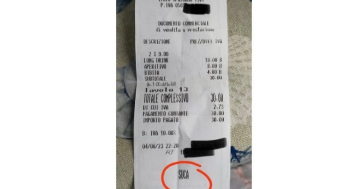 Il prezzo era di 30 euro, regolarmente pagato dal cliente che ha consumato due cocktail, un piattino da aperitivo e una bibita. Quando però la cassa gli ha consegnato lo scontrino l’occhio è caduto su una scritta sulla parte finale che recitava “suca”.
