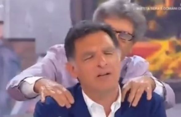 Nel frattempo Timperi sbuffa, cosa che non passa inosservata a Ippoliti che gli chiede: “Tiberio dimmi, vedo che sbuffi”. Timperi prova a minimizzare, dicendo: “Vai avanti, ne parliamo dopo”, ma Ippoliti si impunta e dice mentre gli massaggiava la schiena: “Caro Tiberio ti faccio un bel massaggio e mi dici cosa volevi dire”.