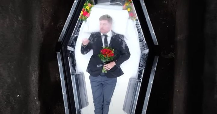 Mr Beast segue sempre lo stesso schema: prima con un titolo annuncia la sua futura sfida, per poi aggiungere di volta in volta elementi che monitorano l’andamento del video. L’ultima sfida è decisamente folle: farsi seppellire in una tomba e vivere sotto terra per almeno una settimana. La bara era particolarmente spaziosa e lo youtuber aveva a disposizione un sistema di areazione, acqua, cibo in scatola, diversi pesi e una radio per comunicare con l’esterno.