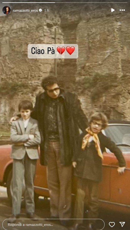 La notizia è stata data dallo stesso cantante con una Storia su Instagram, che ritrae proprio il padre con due bambini (presumibilmente proprio Eros Ramazzotti e il fratello) appoggiati ad una macchina rossa d’epoca con una semplice scritta, “Ciao pà”, accompagnata da due cuori: uno intero e l’altro spezzato.