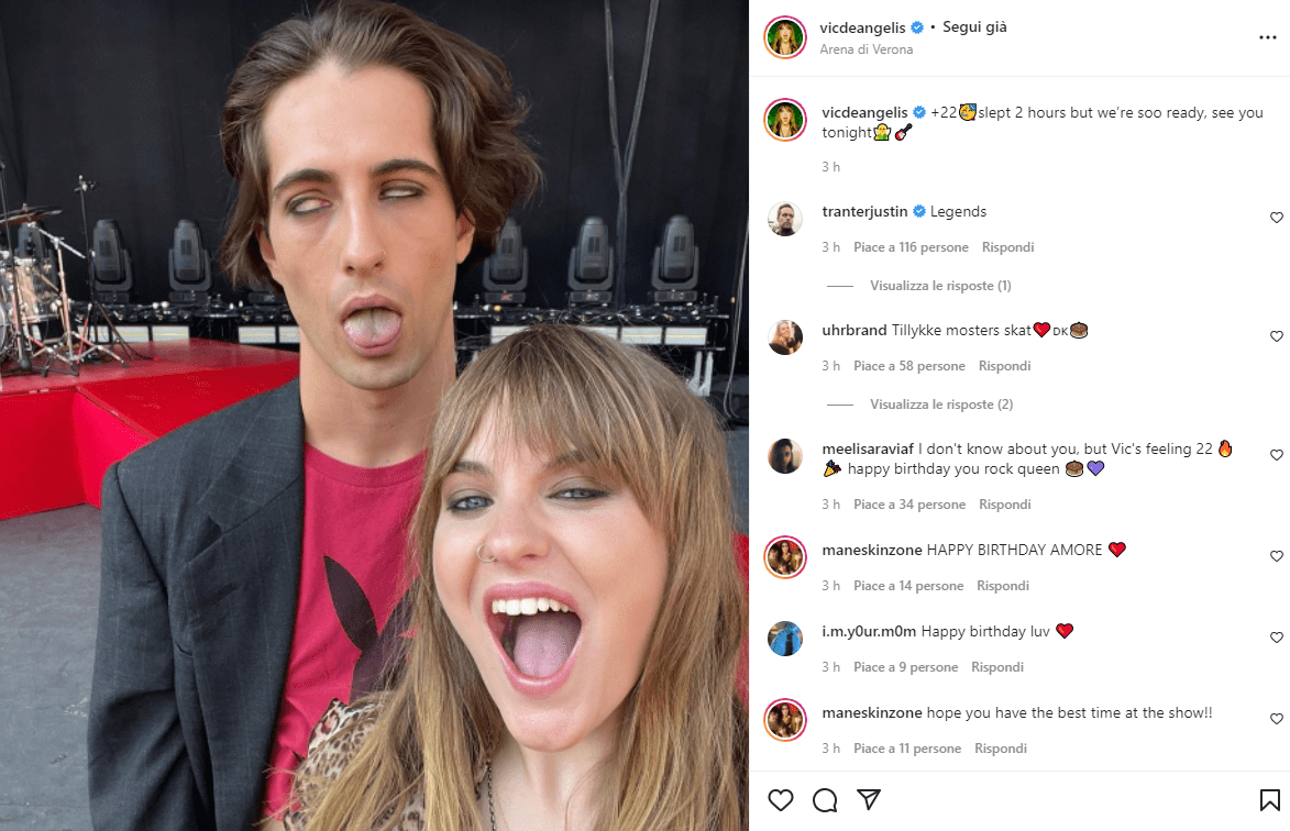 Victoria De Angelis non si smentisce mai. L’esuberante fondatrice dei Maneskin si mostra su Instagram in compagnia di quell’altro mattacchione di Damiano David, il frontman che scherza come vedete sullo stato di forma a poche ore dall’attesissimo concerto nell’Arena di Verona.