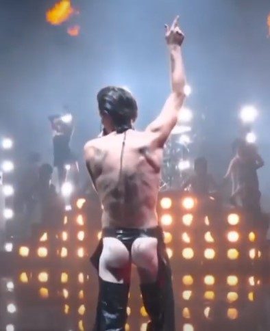 Damiano infatti, dopo essersi tolto il mantello, è salito sul palco sfoggiando dei pantaloni in vinile con frange laterali in stile western con tagli sulle cosce e sul sedere che hanno messo in risalto un micro-perizoma. Quando il cantante si è girato di spalle al pubblico, ha mostrato il suo lato B senza veli.