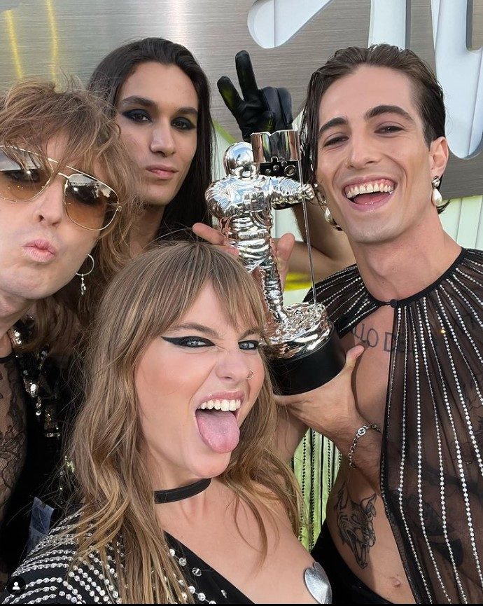 I Maneskin hanno conquistato la passerelle degli VMA’s 2022 anche grazie al loro look a dir poco audace, fatto di paillettes e dettagli bondage in stile glamour fino all’eccesso.