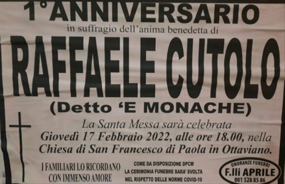 Nei giorni scorsi ad Ottaviano sono comparsi dei manifesti funebri per annunciare la messa in onore di Raffaele Cutolo, l’ex boss nella NCO (Nuova Camorra Organizzata) morto lo scorso anno il 17 febbraio 2021. Il manifesto ricorda Cutolo, noto come “‘ o professore”, come un'”anima benedetta”.