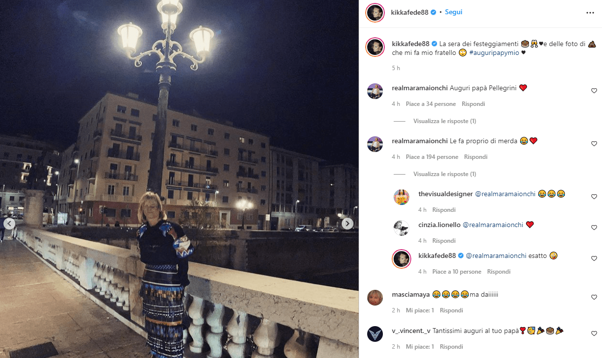 In effetti non sono gli scatti di un professionista… E a sottolinearlo giunge Maria Maionchi con lapidario: “Le fa proprio di merda”. Giudizio che ricevi centinaia di consensi e un “Esatto” di approvazione Fede, molto legata alla discografica, con la quale da anni condivide la giuria del talent. Maionchi che poi non dimentica, comunque, il tema delle foto e scrive: “Auguri papà Pellegrini”, ricevendo il ringraziamento da tutta la famiglia, fratello bocciato compreso.