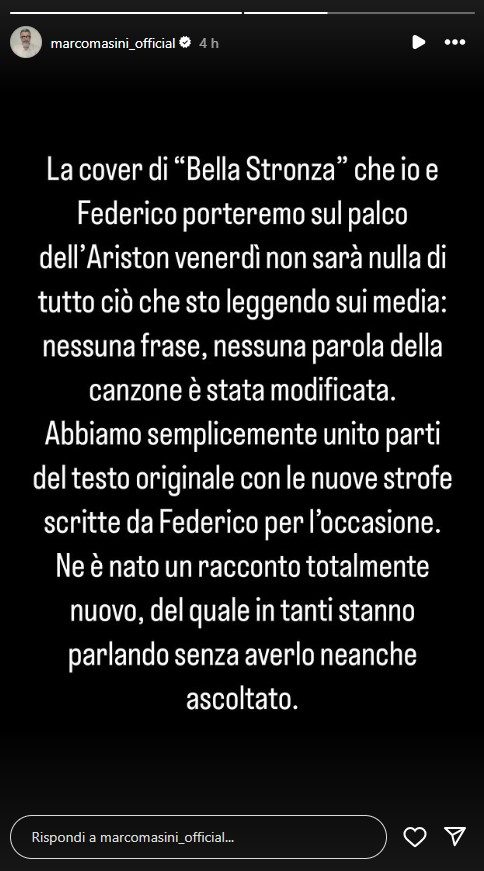 Marco Masini è voluto intervenire personalmente, con una Storia su Instagram dove ha spiegato che la cover “Bella str***a” non sarà nulla di tutto ciò che sta leggendo sui media. Ha poi specificato che nessuna frase o parola della canzone è stata modificata, ma semplicemente che al testo originale sono state aggiunte delle strofe scritte da Fedez. “Ne è nato un racconto totalmente nuovo, del quale in tanti stanno parlando senza averlo neanche ascoltato” – ha concluso Masini. Cresce l’attesa per uno dei Festival di Sanremo che si preannunciano più “gossippari” di sempre, soprattutto per la presenza di Tony Effe protagonista di un furioso dissing con Fedez e Achille Lauro che avrebbero avuto un flirt con Chiara Ferragni secondo gli esperti di gossip.