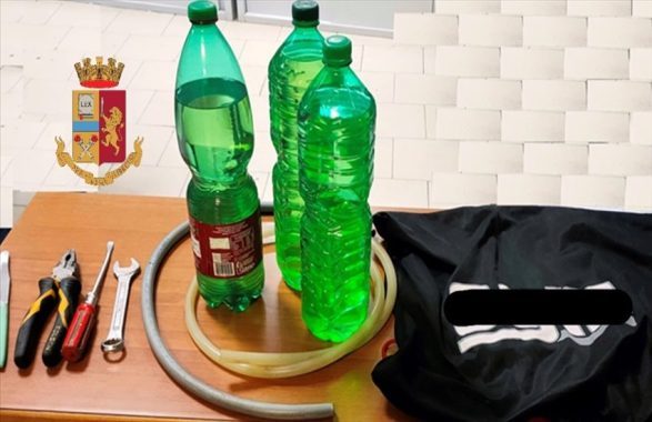 I poliziotti, giunti sul posto, hanno sorpreso un uomo che stava asportando della benzina da un motociclo e lo hanno bloccato trovandolo in possesso di due tubi in plastica mentre, nel vano sottosella dello scooter in uso all’uomo, hanno rinvenuto tre bottiglie contenenti carburante e diversi arnesi atti allo scasso.