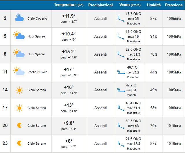 Durante la mattina, la temperatura si attesterà intorno ai +16,6°C, con una leggera brezza proveniente da Ovest. L’umidità sarà del 53% e la pressione atmosferica sarà di 1005hPa.