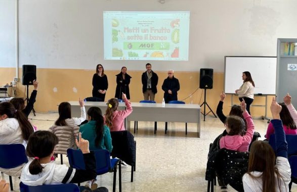 Ha preso il via ieri mattina, con prima tappa all’Istituto comprensivo Garibaldi, la seconda edizione di “Metti un frutto sotto il banco”, il progetto e concorso promosso dal Comune di Fondi e dal Mof allo scopo di portare sui banchi di scuola le corrette abitudini alimentari. Tantissime le domande degli studenti delle classi della primaria alla nutrizionista Martina Parisella. Hanno voluto partecipare alla lezione inaugurale anche il sindaco Beniamino Maschietto, l’assessore alle Attività Produttive Stefania Stravato e il direttore del Mof Roberto Sepe. Apprezzatissimo il dono ricevuto dagli studenti, ovvero un sacchetto ecosostenibile contenente frutta proveniente dal Mof, indispensabile per iniziare ad applicare sin da subito le regole di una sana e corretta alimentazione.