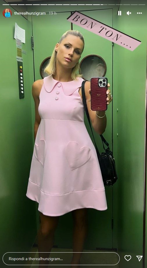 La Hunziker si è scattata un selfie con un mini abito rosa confetto, caratterizzato da una gonna a ruota decorata con maxi cuori tono su tono e un corpetto accollato col colletto in stile Peter Pan e bottoncini. Una vera “rottura” con gli outfit “aggressivi” e sensuali sfoggiati finora, come gli abiti in pelle e i tubini aderenti.