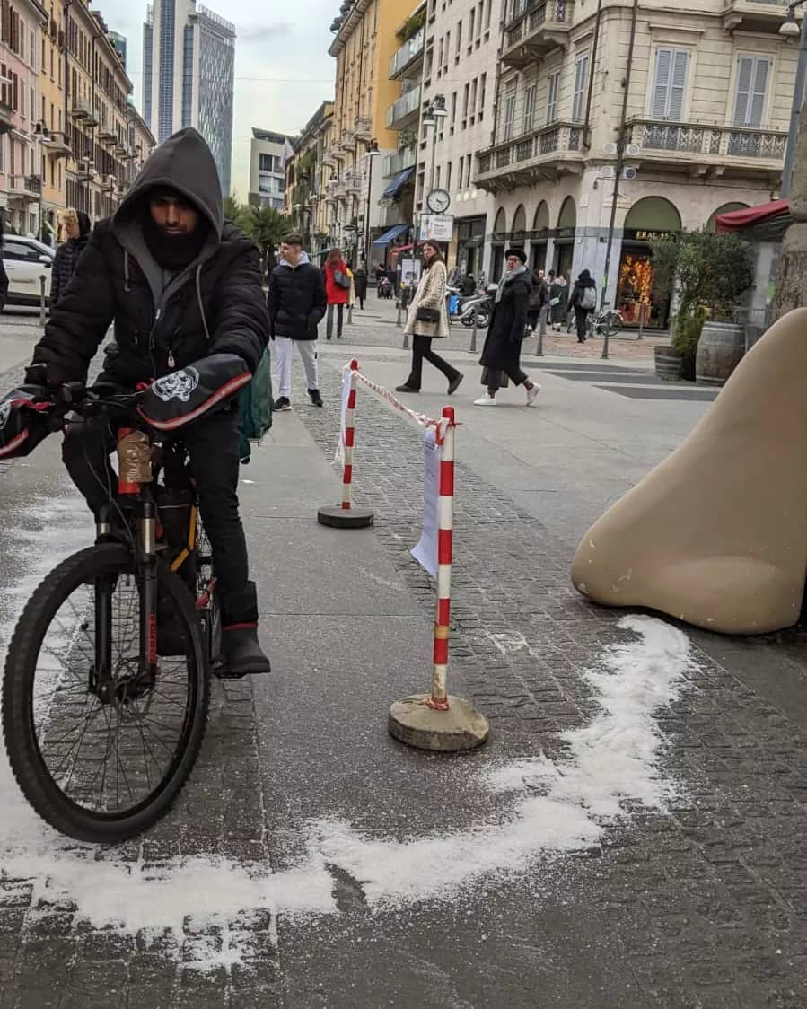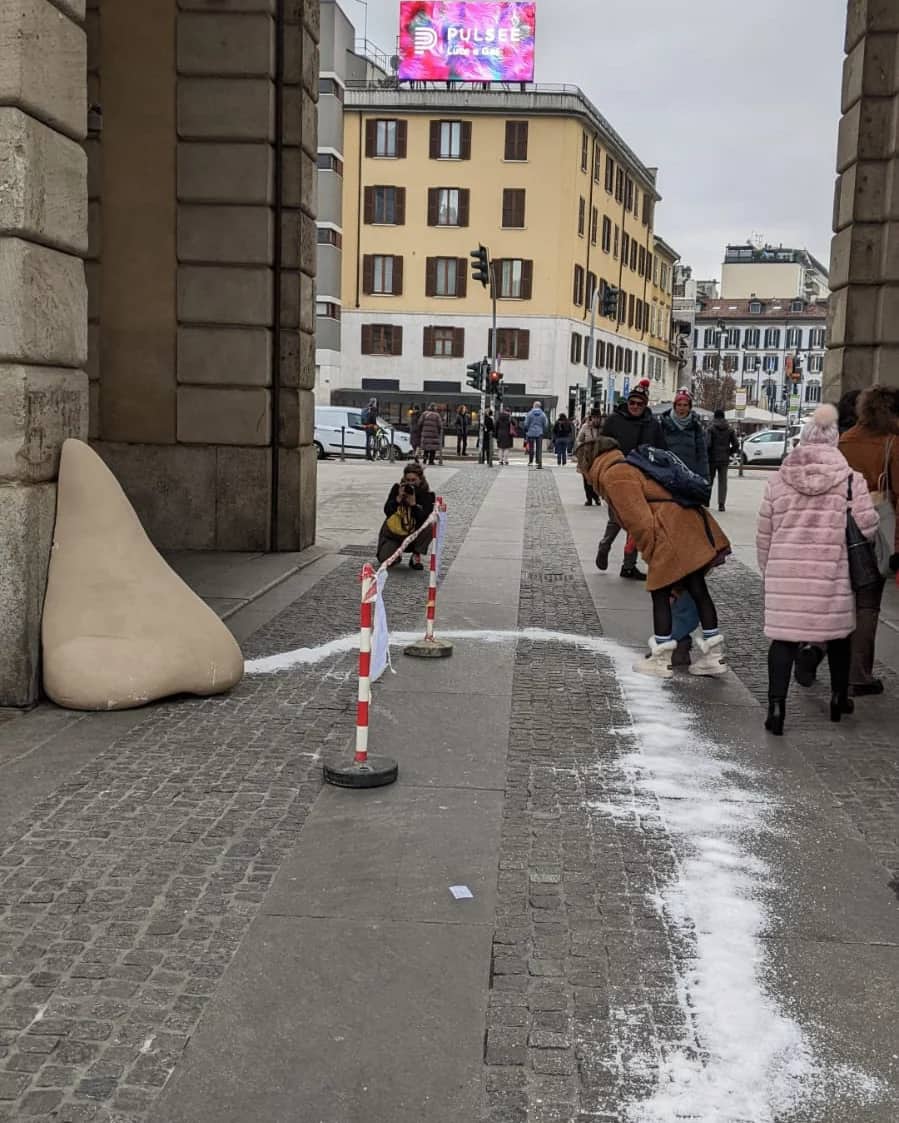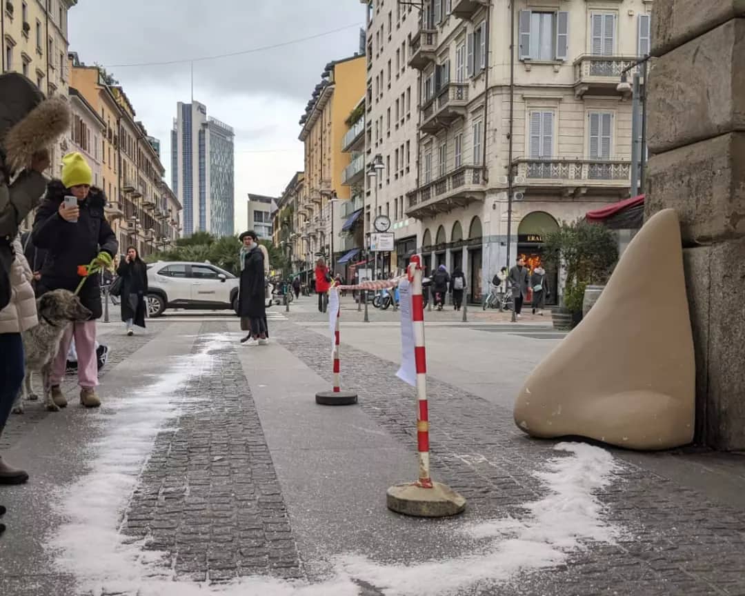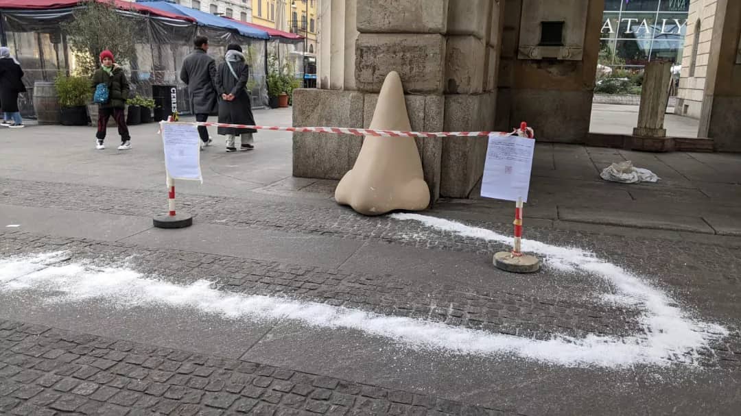 Una “pista” di cocaina e un enorme naso non passano di certo inosservati in Piazza XXV Aprile, zona corso Como. Proprio qui, l’artista Cristina Donati Meyer ha realizzato questa installazione dal titolo emblematico ‘Bianco Natale, Milano-Medellin’.
