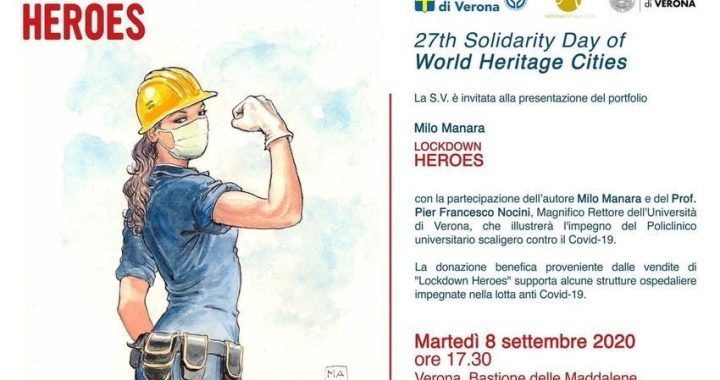 Comune di Verona, Università e Città del Patrimonio Mondiale Unesco. Un mix d’ingredienti particolare, che ha scelto di unirsi per sostenere, martedì 8 settembre nell’area esterna del Bastione delle Maddalene, la 27ᵃ Giornata di Solidarietà delle Città Patrimonio dell’Umanità, con la presentazione pubblica del portfolio Lockdown heroes dell’illustratore Milo Manara.