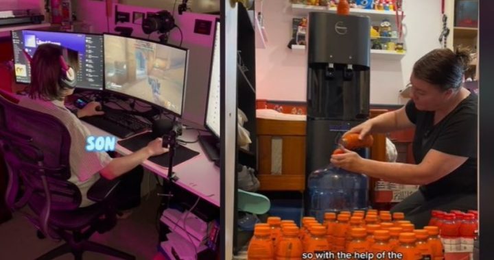 Come ha spiegato la donna il figlio “non gradisce il sapore dell’acqua”, quindi ha trovato un sistema per idratarlo. Ha acquistato un distributore dell’acqua e lo ha riempito con la bevanda energetica Prime, posizionandolo proprio di fianco alla postazione di gaming del figlio. In questo modo il ragazzo non ha bisogno neanche di uscire dalla stanza, infatti gli basta allungare il braccio e premere il tasto del distributore per erogare la bevanda direttamente nella tazza.