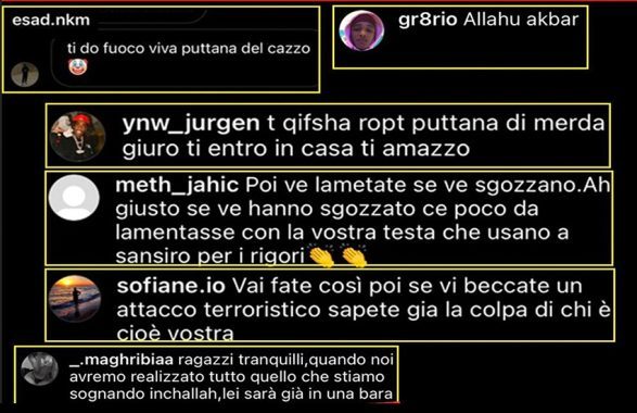 “Sono giorni di violentissime minacce di morte e insulti sui social. Inviti a sgozzarmi, stuprarmi, uccidermi in casa oltre a lodi al terrorismo e alla guerra santa”, ha fatto sapere l’esponente della Lega. Tra le tante che le sono arrivate si legge: “Puttana di merda, giuro ti entro in casa e ti ammazzo”. E ancora: “Zia fai una cosa, prendi la tua croce di m.… e.…, “Fuoco alle chiese”, “Ragazzi tranquilli, quando noi avemo realizzato tutto quello che stiamo sognando inchallah, lei sarà già in una bara”.