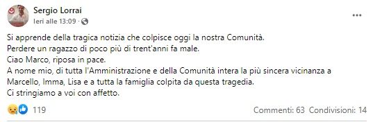 Sul posto sono intervenuti anche i Carabinieri di Tertenia, che hanno avvisato il sostituto procuratore di turno, anche se su questo caso non sarà avviata un’indagine perché si tratta di morte naturale per puntura di ape. Dall’autorità giudiziaria non è stata disposta alcuna autopsia e il nulla osta per la riconsegna della salma ai familiari è stato già rilasciato. Intanto il sindaco ha espresso il proprio dolore per la scomparsa di Marco: “Perdere un ragazzo di poco più di trent’anni fa male. Ciao Marco, riposa in pace. A nome mio, di tutta l’amministrazione e della comunità intera la più sincera vicinanza a tutta la famiglia colpita da questa tragedia”.