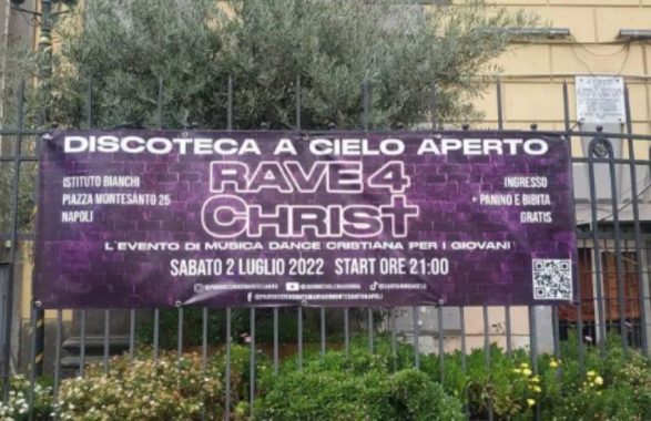 L’iniziativa clou di Don Michele Madonna è però un’altra, e si tratta di un rave party, intitolato Rave 4 Christ e reso noto attraverso l’affissione di uno striscione viola acido tra la chiesa e l’Istituto Montesanti di Napoli, e rivolto a persone di età compresa fra i 15 e i 35 anni. Esso avrà luogo il prossimo sabato 2 luglio con inizio alle ore 21 e il parroco lo rende noto attraverso queste dichiarazioni: “È una serata nella quale vogliamo divertirci, ballare, cantare e stare insieme. Sarà una vera e propria discoteca all’aperto nell’Istituto Bianchi nel centro di Montesanto. Tutto gratuito, compresa la consumazione (panino e bibita). Ne vale veramente la pena, vogliamo per una volta, lasciare i pensieri e lo stress che accompagnano questo periodo, e dedicare del tempo alla gioia di stare insieme e al divertimento”.