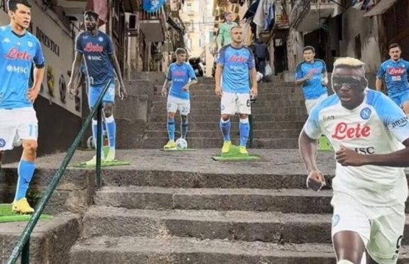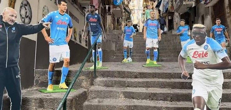 Sale la febbre scudetto a Napoli e la città si sta preparando a festeggiare il tricolore anche se il calcolo aritmetico ancora non consente di assegnare matematicamente il titolo agli azzurri di Spalletti. In città, però, sono già partite le prime celebrazioni della tanto attesa festa, in “stile napoletano”, con la solita originalità e passione. Così, in pieno centro storico, sulle scale di Vico Colonne a Cariati, ai Quartieri Spagnoli – a 50 metri da piazzetta Maradona – sono apparsi i cartonati ad altezza naturale dei giocatori della squadra titolare di questa meravigliosa stagione, schierati come fossero in campo allo stadio Maradona, compresi allenatore e presidente De Laurentiis che si gode lo spettacolo.