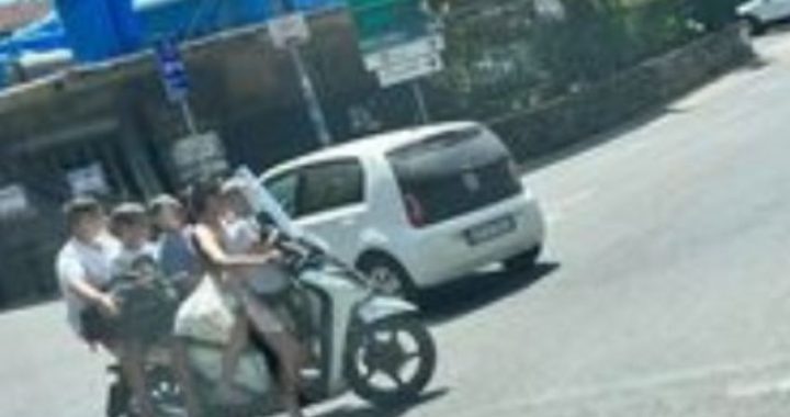 “La foto ci è stata girata da un automobilista – ha esordito Borrelli sul suo profilo Facebook – che in via Montagna Spaccata, zona Quarto, è stato testimone di una scena drammaticamente fantozziana. Un adulto e quattro minori, tutti senza casco, in sella allo scooter, con l’aggiunta di un grosso zaino e una busta della spesa voluminosa. Un totale di cinque viaggiatori più bagagli, è pura fantascienza. Peccato che da ridere non ci sia proprio nulla. Ci sono quattro minori affidati in pessime mani, in pericolo di vita”.