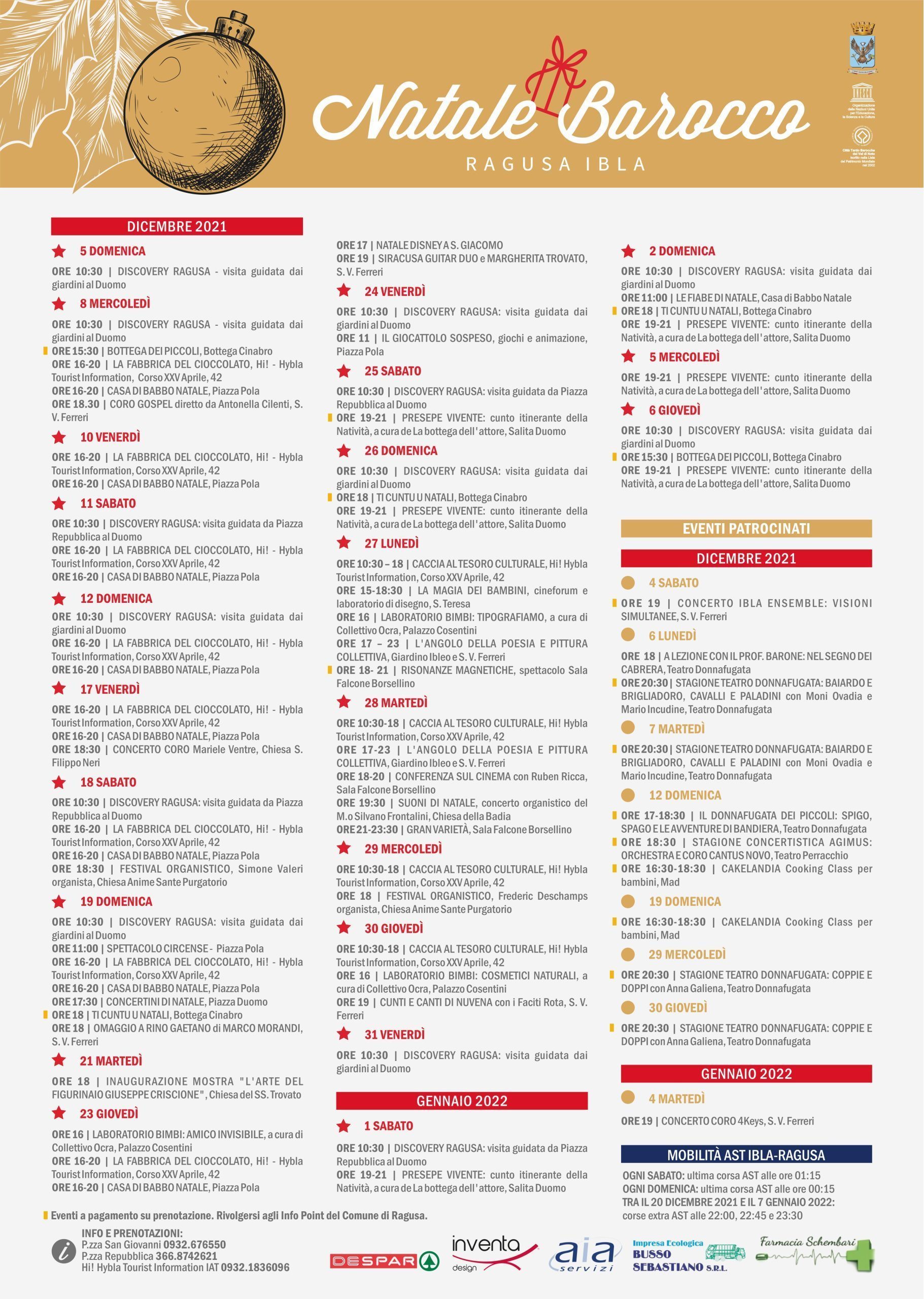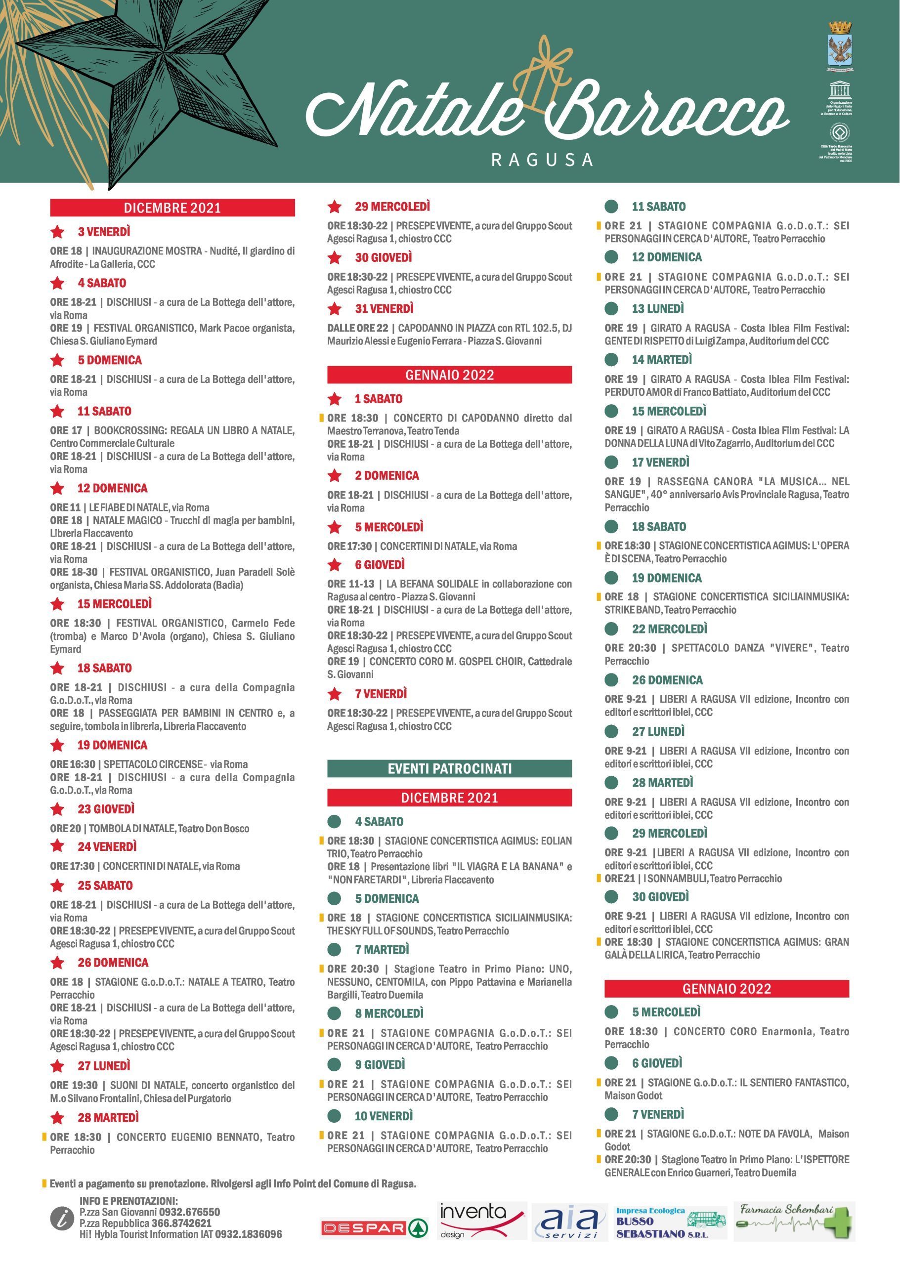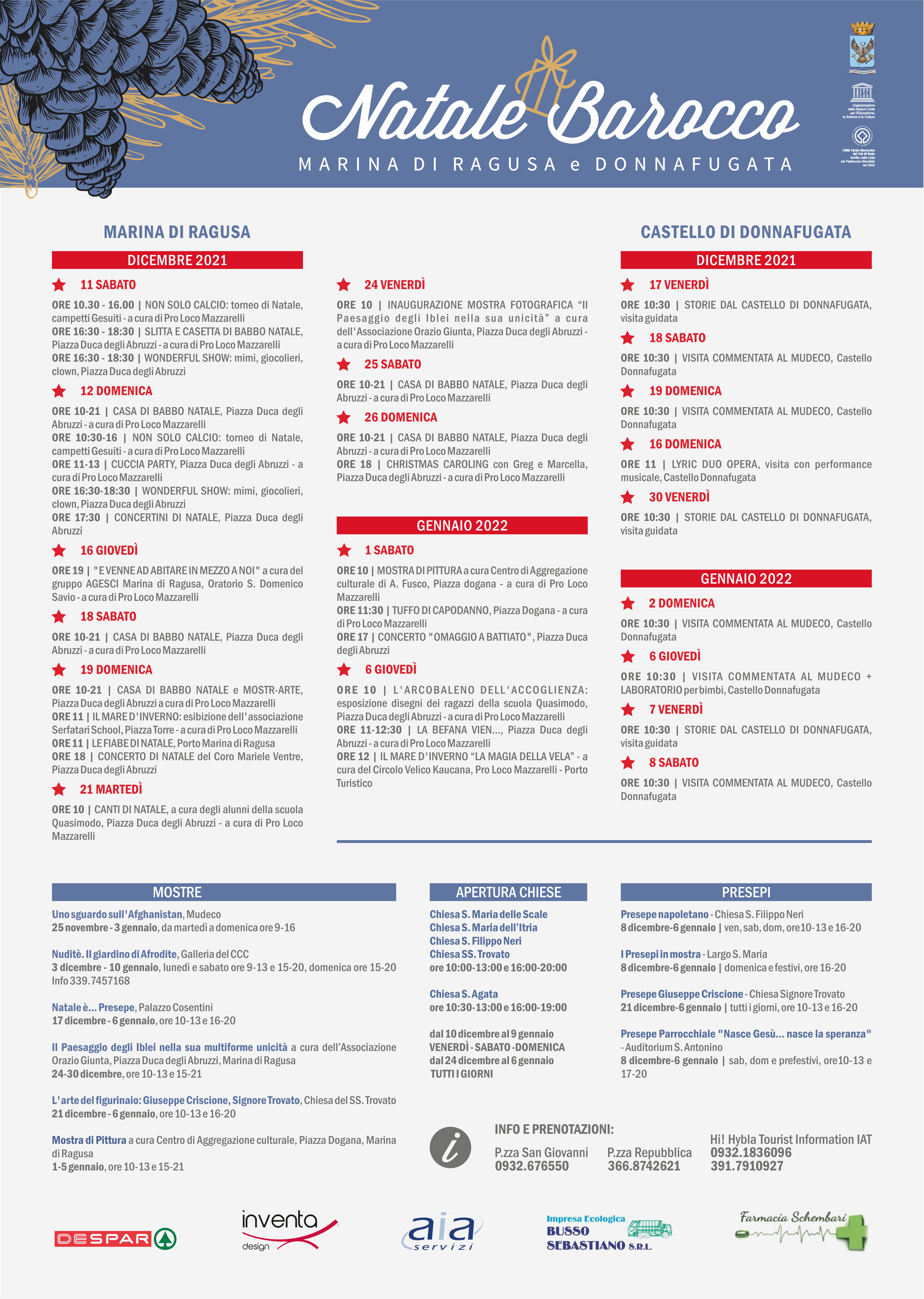 Oltre 100 eventi dislocati tra Ragusa Centro, Ragusa Ibla, San Giacomo, Marina di Ragusa e il Castello di Donnafugata, pensati per i bambini ma anche per gli adulti. Questo sarà il “Natale Barocco 2021” voluto dall’Amministrazione comunale di Ragusa. “Un Natale ricco di atmosfera tradizione e modernità sono le due facce del Natale di Ragusa e provincia. Nel capoluogo e nei centri piccoli e grandi del territorio sono previsti tantissimi eventi, che spaziano tra spettacoli, appuntamenti culturali, e giochi”.