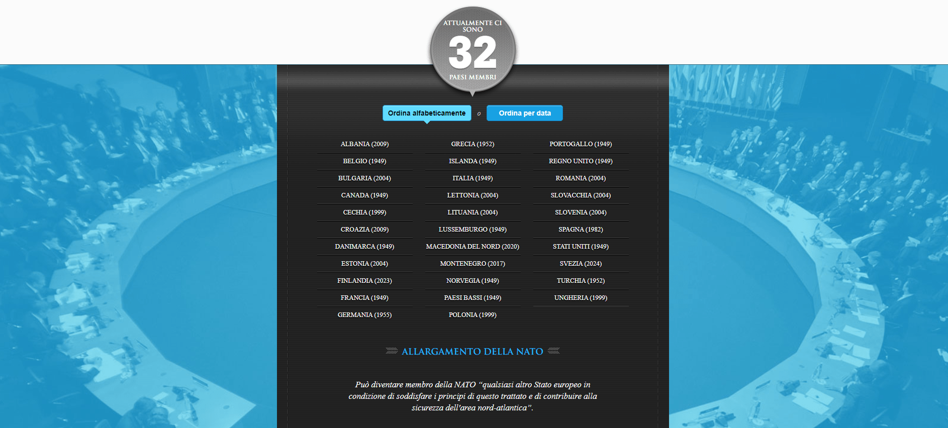 Fondata con la firma del Trattato di Washington dei 12 Paesi fondatori (Belgio, Canada, Danimarca, Francia, Islanda, Italia, Lussemburgo, Paesi Bassi, Norvegia, Portogallo, Regno Unito e Stati Uniti), l’Alleanza Atlantica è poi cresciuta a ondate successive fino a contare gli attuali 32 membri, con il recente ingresso di Finlandia e Svezia.