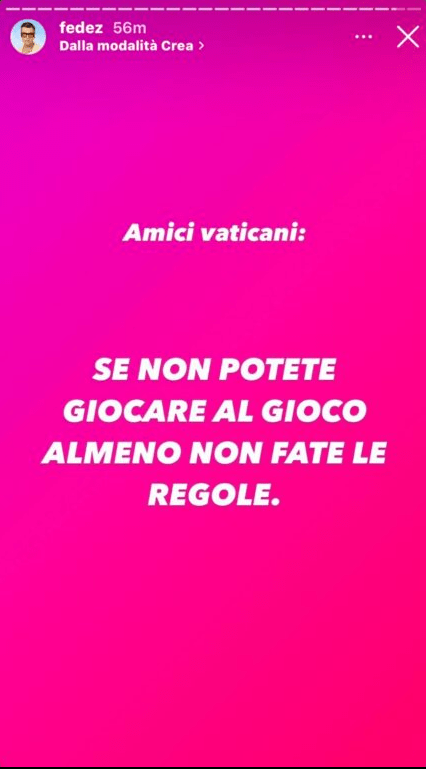 Le parole di papa Francesco all’interno dell’ultimo aggiornamento della Chiesa Cattolica sulla catechesi matrimoniale e riguardanti il ricorso per i ragazzi alla rinuncia dei rapporti sessuali “in contrasto la mentalità comune. Solo quando un amore è casto è veramente amore. La castità è una condizione per la crescita genuina dell’amore interpersonale“ hanno portato Fedez a esprimersi sulle stories di Instagram con queste parole: “Amici vaticani… se non potete giocare al gioco, almeno non fate le regole”.