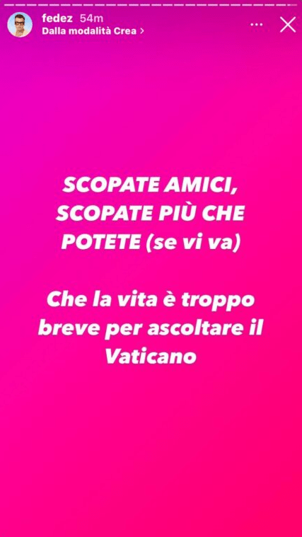 Il suggerimento che Fedez dà ai giovani, sempre nelle stories di Instagram, fa riferimento anche al calo demografico, alla guerra, alla pandemia e ai suoi problemi di salute che lo hanno portato a vivere con un più ottimismo la sua vita, che va vissuta fino in fondo: “Scopate amici, scopate più che potete (se vi va). Che la vita è troppo breve per ascoltare il Vaticano“. Adesso ci sarà da attendere la reazione da parte del mondo vaticano dopo queste parole che lasciano poco spazio alle interpretazioni soggettive.