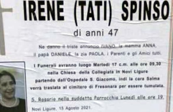Tragedia a Novi Ligure, nell’Alessandrino, dove Irene Spinso, 47enne, è morta di ictus. Ieri si sarebbero dovuti svolgere i suoi funerali, ma i famigliari hanno deciso di bloccare tutto, facendo presente che potrebbe aver influito sul decesso il vaccino anti covid fatto solo pochi giorni prima della scomparsa.