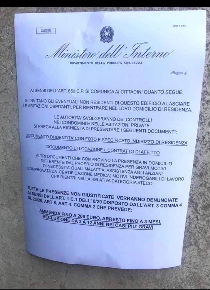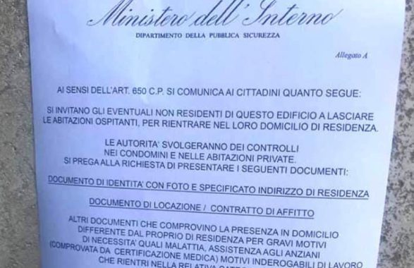 Negli androni di vari palazzi di diverse città, ma anche sui muri dei quartieri, sono stati affissi dei volantini che recitano così: “Si invitano gli eventuali non residenti di questo edificio a lasciare le abitazioni ospitanti, per rientrare nel loro domicilio di residenza. Le autorità svolgeranno dei controlli nei condomini e nelle abitazioni private”.