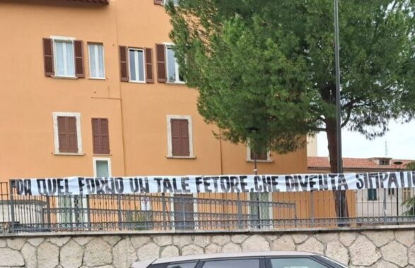 “Da quel forno un tale fetore che diventa simpatico anche il questore“. Questa la nuova frase, vergata con vernice nera, apparsa su uno striscione affisso nella notte in viale De Gasperi, nei pressi dei giardini pubblici di Ascoli Piceno.