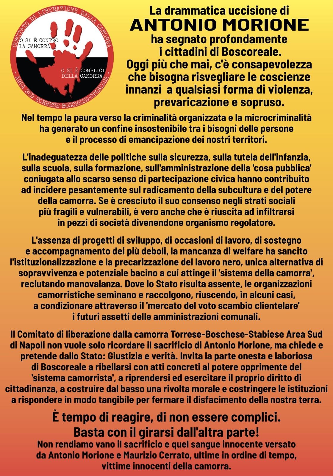 Dopo oltre un mese dalla tragica morte di Antonio Morione, ancora non sono stati individuati i suoi sanguinari assassini. Il Comitato di liberazione dalla camorra Torrese-Boschese-Stabiese Area Sud di Napoli, che si batte contro la criminalità e la camorra, ha pubblicato un manifesto, invitando la popolazione a squarciare il velo di omertà.