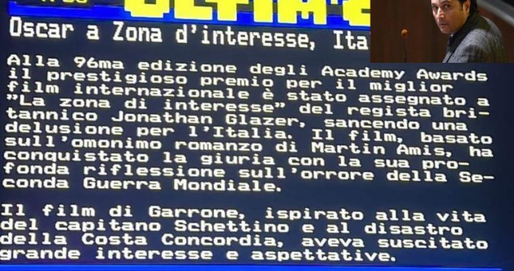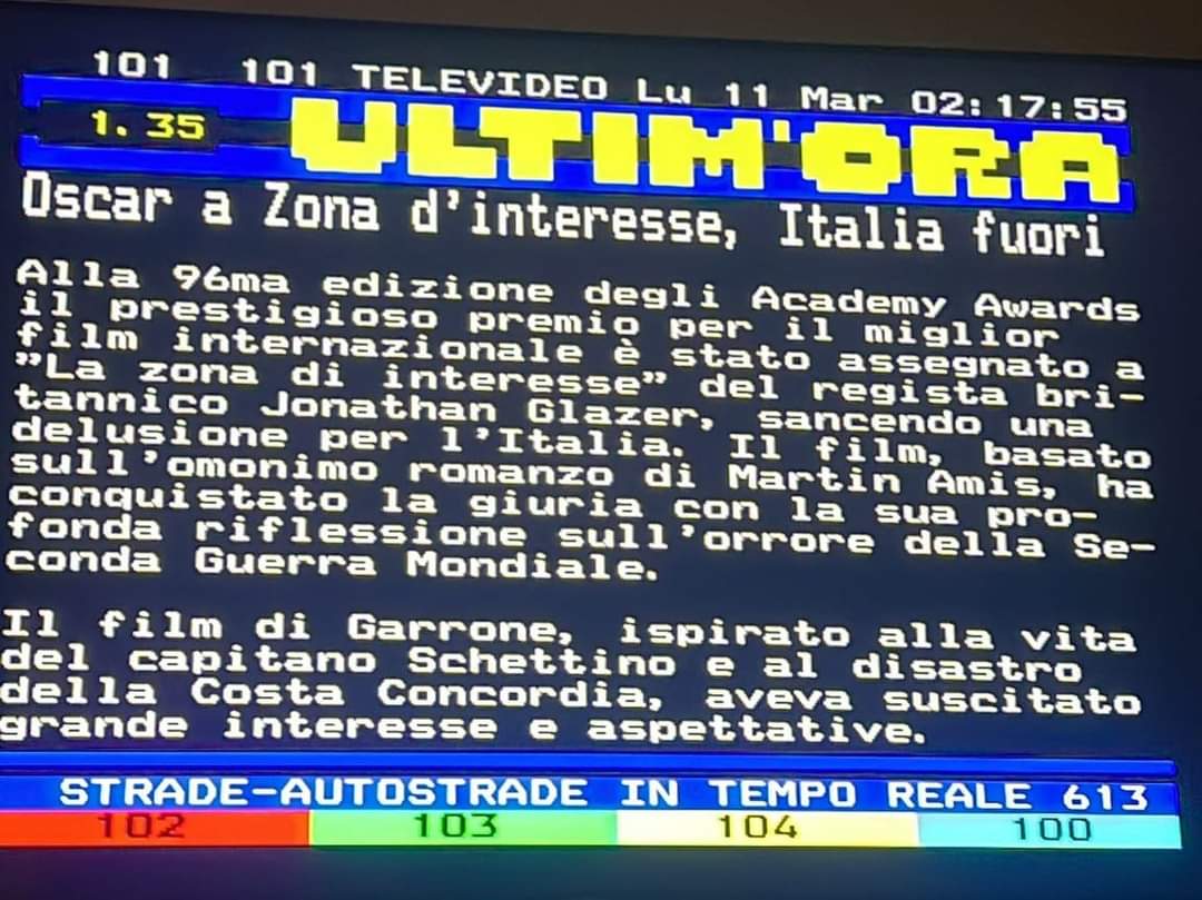 Sulla pagina del Televideo è passata la notizia del film “La zona di interesse”, che ha battuto il film di Garrone “Io capitano” ispirato alla vita del capitano Schettino e al disastro della Costa Concordia. Inoltre la pagine del Televideo aveva aggiunto che il film “aveva suscitato grande interesse e aspettative”.