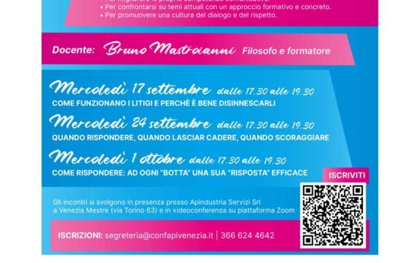 La partecipazione mira ad acquisire strumenti utili nella gestione dei conflitti, migliorare le proprie competenze comunicative, confrontarsi su temi attuali con un approccio formativo e concreto, e promuovere una cultura del dialogo e del rispetto. Le iscrizioni sono aperte contattando segreteria@confapivenezia.it o chiamando il numero 366 624 4642, con possibilità di registrarsi anche tramite il codice QR presente sulla locandina.