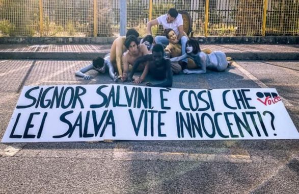 Ad accompagnare lo striscione anche un flash-mob nel quale Salvini è rappresentato seduto su una sedia, mentre ai suoi piedi muoiono e chiedono aiuto dei migranti.