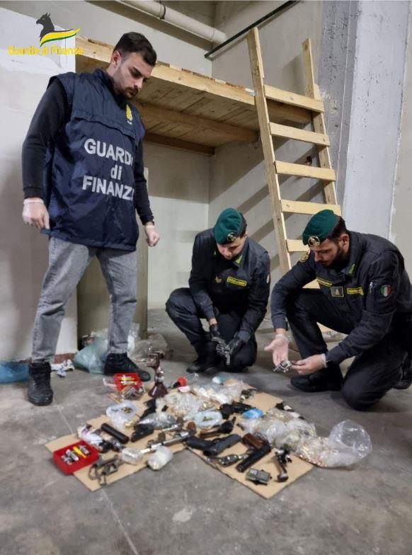 Nel corso della seconda perquisizione, effettuata nel garage, è stato scoperto un vero e proprio arsenale di armi e proiettili nascosti in un’intercapedine ricavata nel contro-soffitto con assi di legno avvitate che coprivano tutto il tetto. Rimosse le assi di legno, sono state trovate pistole, proiettili, silenziatori, caricatori. Sono stati sequestrati: 14 armi da fuoco tra revolver e pistole semiautomatiche, 1431 tra cartucce, bossoli e proiettili, 8 caricatori, 4 silenziatori, 40 inneschi, buste di polvere da sparo nonché una grande quantità di parti di pistole tra castelli per revolver, tamburi, impugnature, canne e materiale vario per la fabbricazione di cartucce.