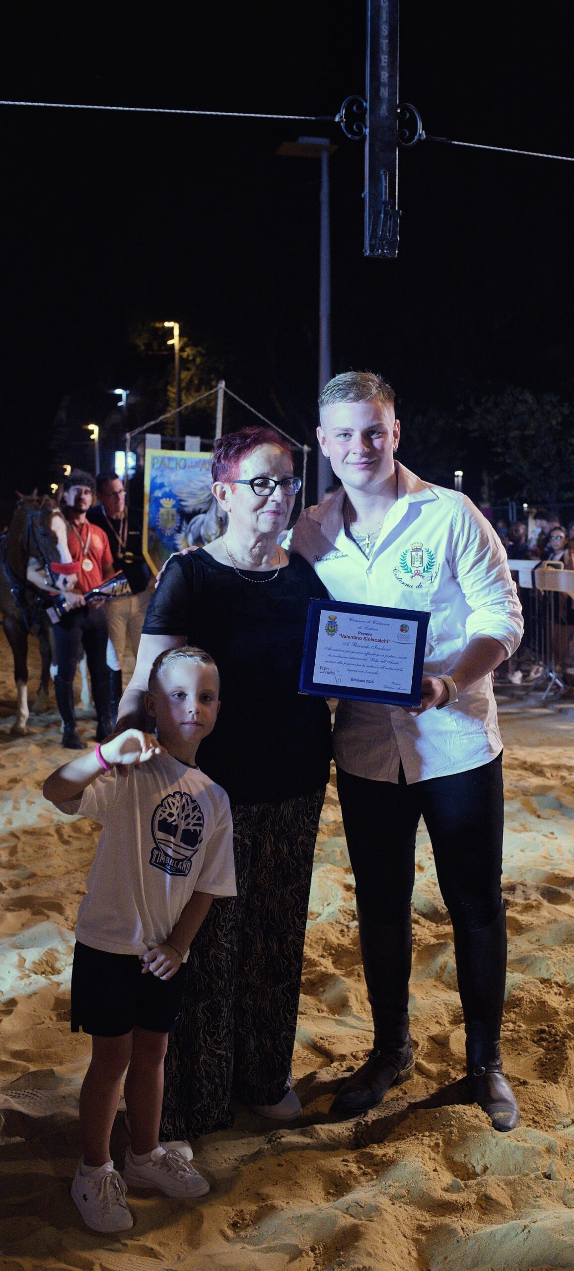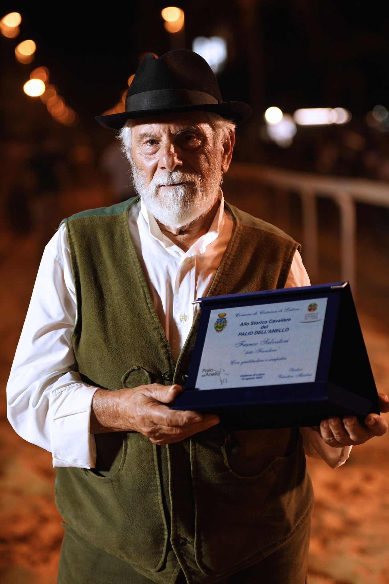 I riconoscimenti non sono mancati: il Premio Valentino Siniscalchi è stato assegnato al più giovane cavaliere, Riccardo Iacobucci di Cisterna. Un’altra targa è stata consegnata al veterano del Palio, Franco “Franchino” Salvatori, e una targa di riconoscimento è andata anche all’artista Maria Pia Biagini, autrice dello stendardo, con la cerimonia di consegna a cura del Sindaco di Cisterna, Valentino Mantini.