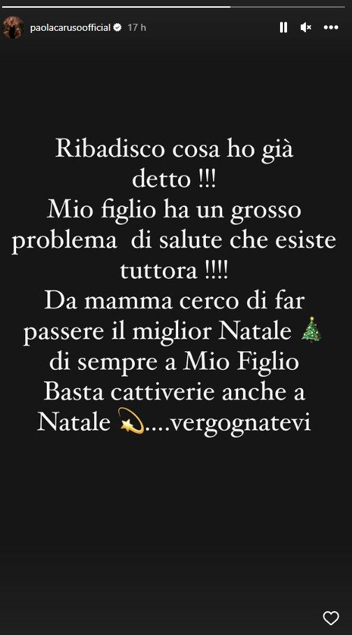 Dinanzi a tanta cattiveria la Caruso ha deciso di risponde con una Storia su Instagram, senza audio e con sfondo nero, scrivendo: “Ribadisco cosa ho già detto. Mio figlio ha un grosso problema di salute tuttora. Da mamma cerco di far passare il miglior Natale di sempre a mio figlio. Basta cattiverie anche a Natale. Vergognatevi”.