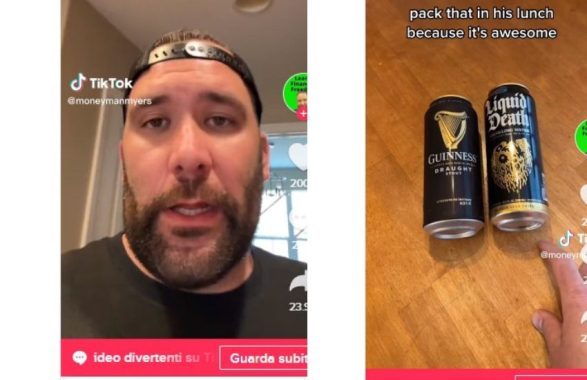 Will spiega che ha scambiato per errore una lattina di acqua frizzante della Liquid Death con una lattina di birra Guinness. Nel video l’uomo ha messo vicino le due lattine per confrontarle e, in effetti, sono entrambe di colore nero e hanno varie decorazioni e scritte in giallo dorato.