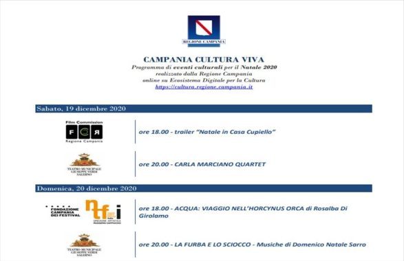 Al via “Campania Cultura Viva”, il programma di eventi culturali per il Natale 2020 realizzato dalla Regione Campania e disponibile gratuitamente online sul portale dell’Ecosistema Digitale per la cultura https://cultura.regione.campania.it.