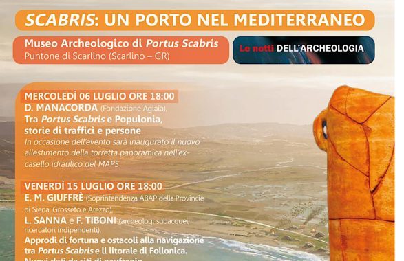 In occasione de Le Notti dell’Archeologia 2022 indette dalla Regione Toscana, i Musei di Scarlino dedicano i propri appuntamenti di luglio al mare e all’archeologia subacquea, raccontando la storia del Portus Scabris e di altri approdi antichi della costa tirrenica con una serie di incontri dal carattere divulgativo e di condivisione con la comunità che faranno rivivere la storia millenaria dell’antico porto di Scarlino e il suo importante ruolo nei traffici navali di età etrusca e romana.