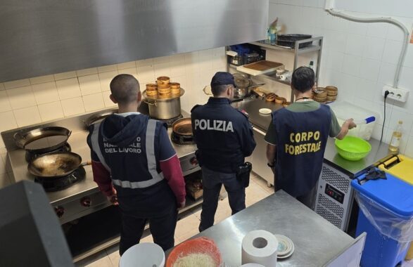 Durante i controlli in cucina, gli agenti hanno sequestrato 80 chili di alimenti – in gran parte prodotti ittici destinati alla preparazione di sushi – privi di etichette e tracciabilità.