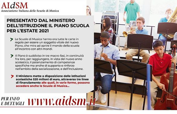 L’Associazione Italiana delle Scuole di Musica (AIDSM) è pronta alla sfida del “Piano scuola per l’estate 2021” presentato dal Ministro dell’Istruzione Patrizio Bianchi.