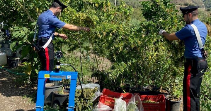 Durante l’attività di controllo e prevenzione del territorio, i carabinieri della sezione operativa, supportati dai carabinieri della stazione di Letojanni (ME) da alcuni giorni monitoravano la località Mastrissa del Comune di Castelmola, ed in particolare tenevano sotto osservazione un terreno agricolo recintato con all’interno un casolare, ove avevano notato movimenti sospetti di persone. Nella mattinata di ieri i carabinieri hanno pertanto effettuato un’irruzione all’interno della proprietà e la perquisizione domiciliare ha permesso di scoprire che il terreno era stato adibito ad una vera e propria piantagione di canapa indiana in cui era stato realizzato anche un impianto d’irrigazione ed il casolare era utilizzato ad hoc come essiccatoio e per il confezionamento delle dosi. Sono state rinvenute in totale 7 piante di canapa alte poco meno di 3 metri, abilmente occultate tra i filari delle piante di fagiolo, circa 5 kg. di infiorescenze di marijuana già “lavorate” ed in fase di essiccazione ed oltre 2 kg. di foglie di marijuana predisposte per l’essiccazione, per un totale di circa 18 kg. di marijuana. Il blitz improvviso dei carabinieri, avvenuto attraverso una feritoia ricavata nella recinzione per il passaggio dei conigli selvatici, ha permesso di sorprendere due uomini, padre e figlio, già con precedenti specifici, mentre erano intenti nella lavorazione dello stupefacente utilizzando una pressa idraulica. Pertanto i due uomini sono stati arrestati, in flagranza di reato, per coltivazione e detenzione ai fini di spaccio di sostanze stupefacenti, e tradotti presso la Casa Circondariale di Catania Piazza Lanza, a disposizione dell’Autorità Giudiziaria in attesa della celebrazione del rito direttissimo.