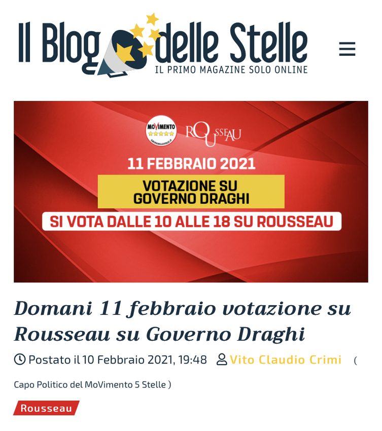 Piattaforma Rousseau sotto la lente. Lo si afferma nello schieramento eterogeneo dei Cinquestelle: sarà avviata domani la consultazione on line degli iscritti e durerà meno di 24 ore. Obiettivo di primo livello: valutare l’adesione al governo Draghi. Si sottolinea il fine di non interferire con le procedure costituzionali (mentre parliamo le consultazioni volgono al termine, con Wwf Italia – Greenpeace Italia – Legambiente). Non manca chi attende un segnale da Mario Draghi, presidente del Consiglio incaricato. Peraltro, non è previsto che questa sera questi attui un intervento pubblico, al termine delle sue consultazioni per la formazione del nuovo governo. Le perplessità in argomento, parlando di Rousseau, hanno per ora portato al rinvio della procedura di voto.