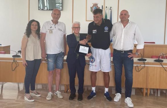 Il Comune di Fondi ha organizzato una cerimonia di premiazione per celebrare il successo di Giuseppe Romano, un atleta locale che ha conquistato la medaglia d’oro con la nazionale italiana di basket over 50 agli europei 2023 tenutisi ad Albufeira, in Portogallo. Durante l’evento, svoltosi il 29 giugno presso il municipio, è stata consegnata una targa simbolica a Romano per onorare il suo straordinario risultato sportivo.