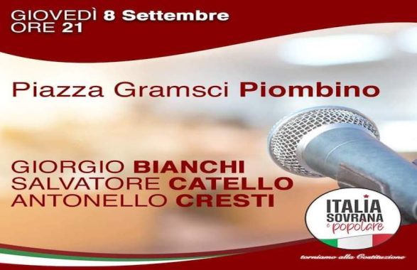 Italia Sovrana e Popolare è l’ unica forza anti sistema presente su tutto il territorio nazionale. Da sempre siamo impegnati contro il rigassificatore di piombino, ritenendolo nocivo, pericoloso, inutile e dannoso. Dopo aver partecipato, dando il nostro sostegno, all’ultima manifestazione dei Comitati in Piazza Bovio, ci presenteremo alla cittadinanza piombinese e della Val di Cornia con i nostri candidati in un comizio pubblico che si terrà Giovedì 8 settembre alle ore 21 in Piazza Gramsci.Le forze politiche che hanno governato fino ad ora stanno facendo di tutto per oscurare il nostro partito sui media mainstream, ma noi rispondiamo riempiendo le piazze!